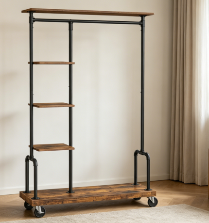 Double Rod Clothes Rack with Wheels and Shelf, Metal Garment Organizer