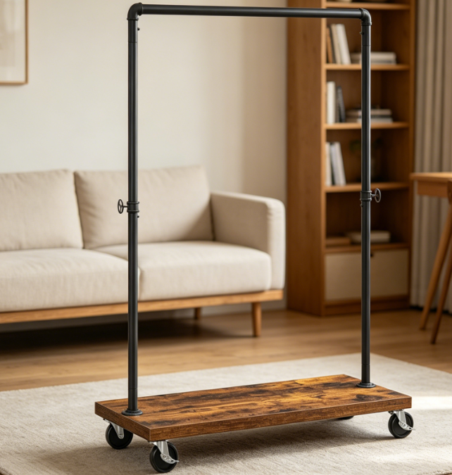 Industrial Style Clothes Rack with Shelf, Rolling Garment Organizer
