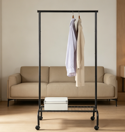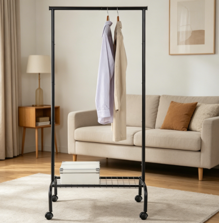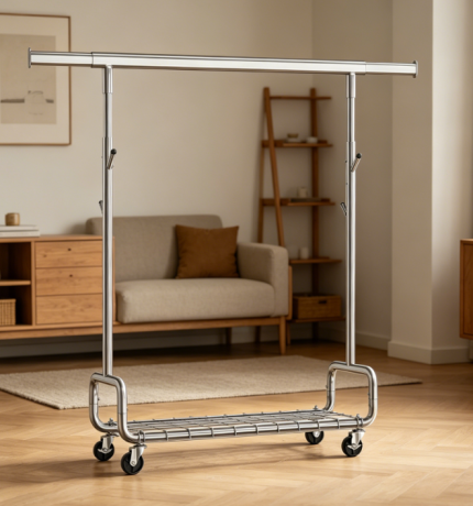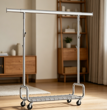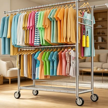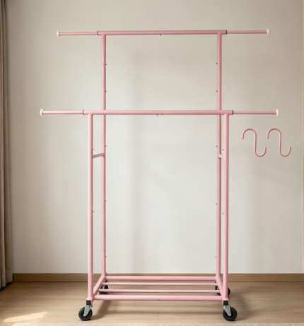 Double Rod Clothes Rack with Wheels and Shelf, Metal Garment Organizer