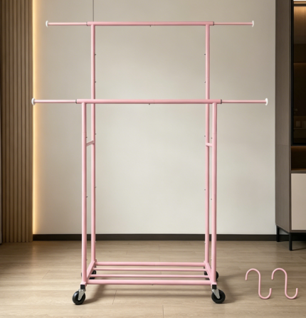 Double Rod Clothes Rack with Wheels, Adjustable Metal Garment Organizer